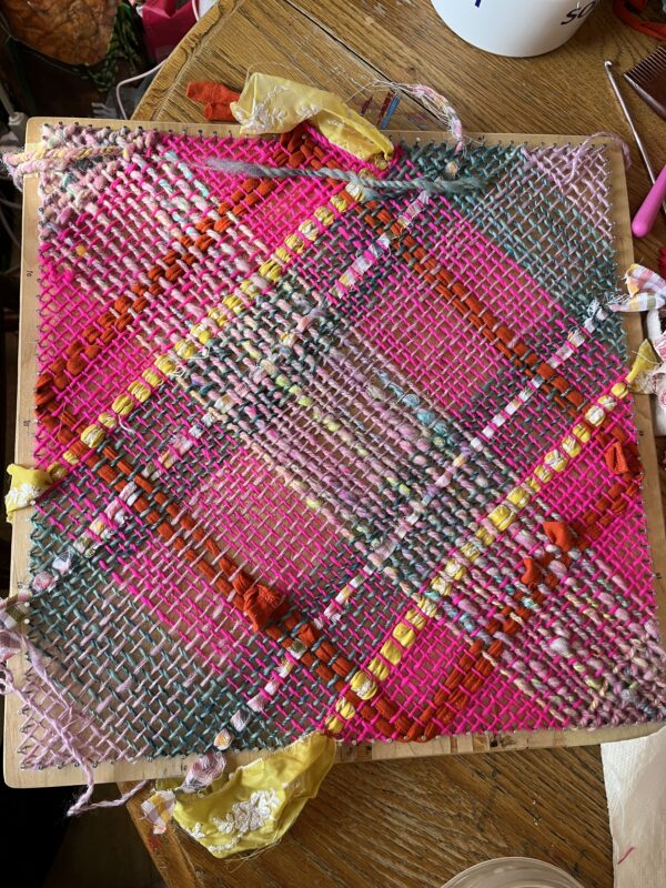 Handspun merino wool and recycled fabrics all handwoven on a pin loom. 5 completely unique squares are created and then stitched together to create a one-of-a-kind piece of wearable art!