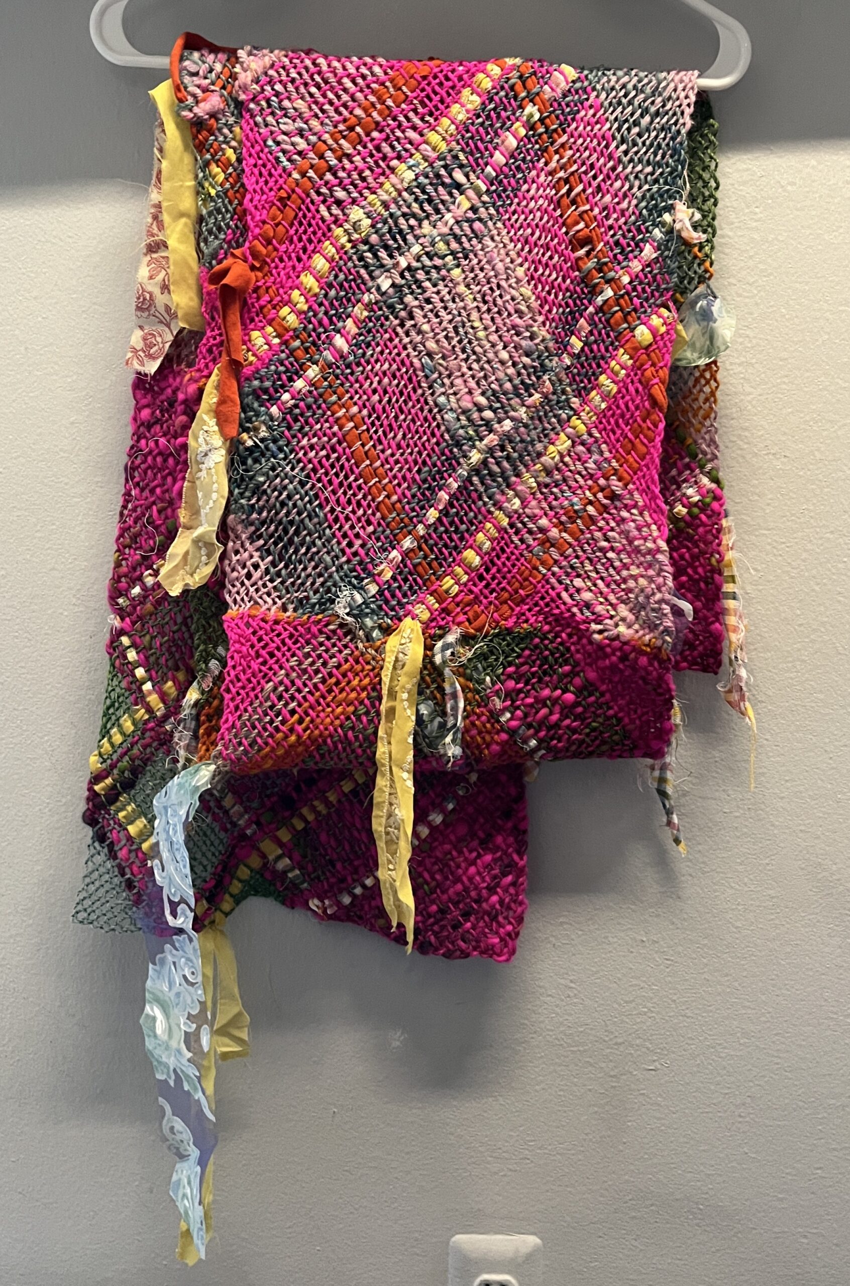 Scrappy scarf with pink, green, blue, and yellow: 13 inches wide by 68 inches long
