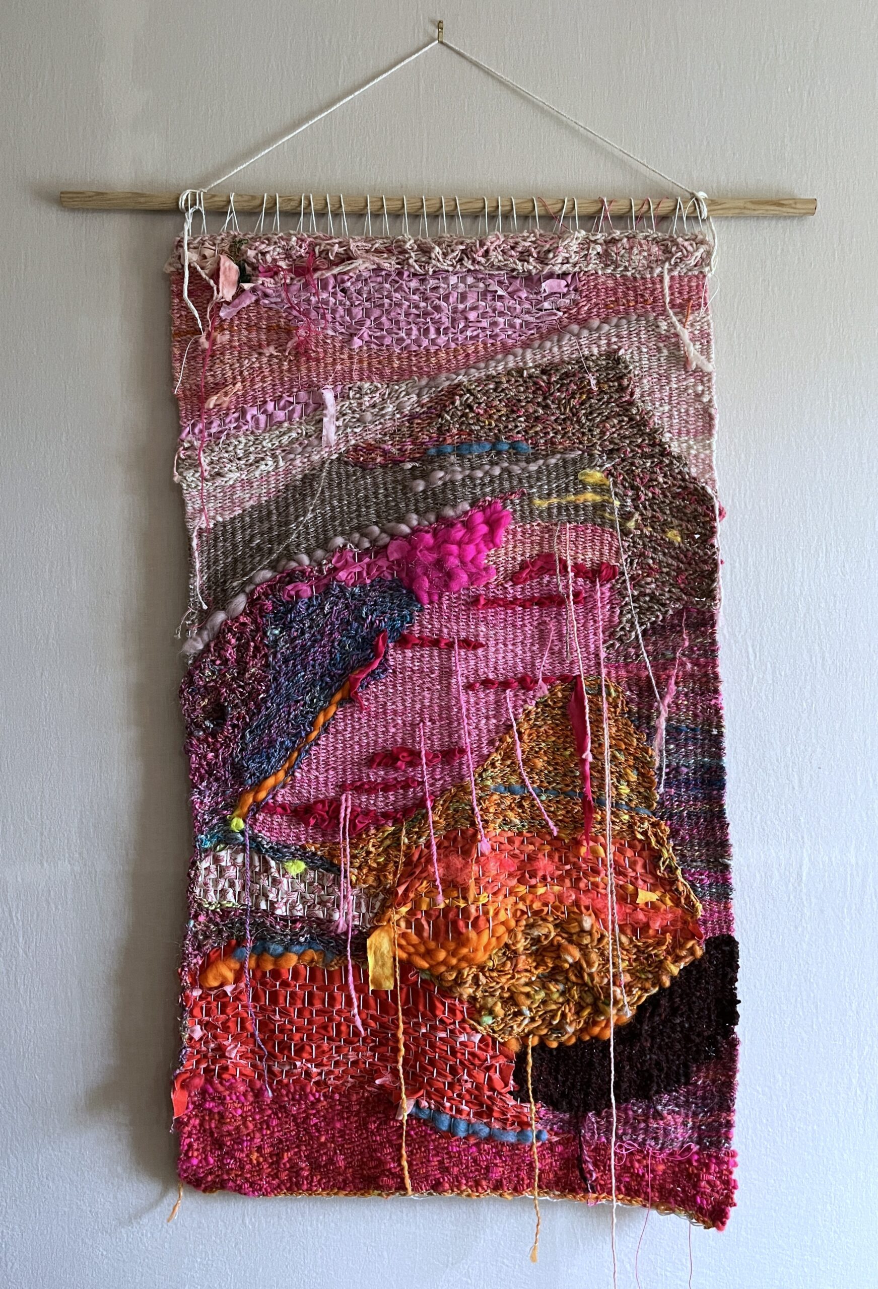 30″ x 50″ wall hanging handwoven with hand spun yarn, commercial yarn, and fabric.